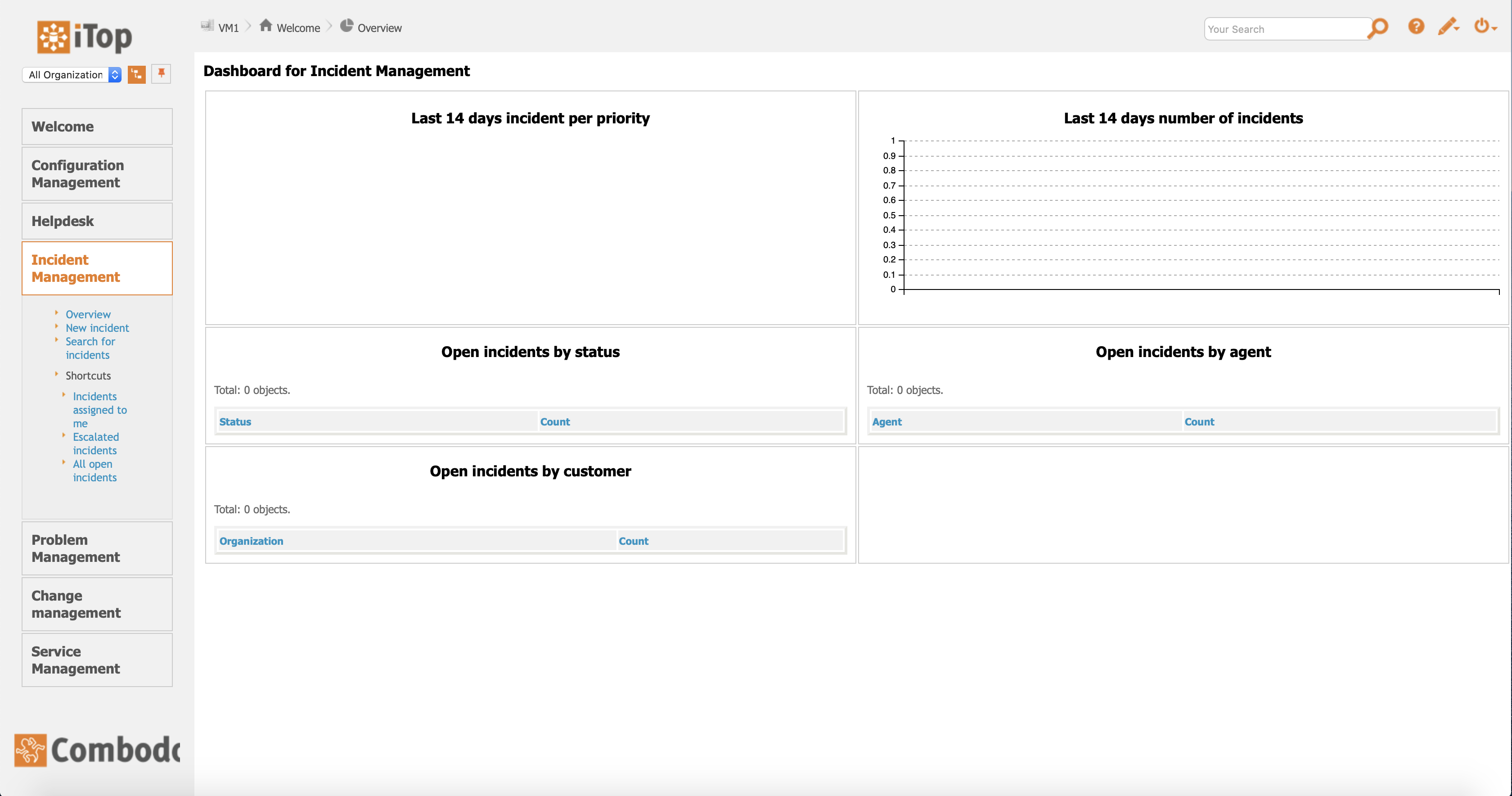 Po prihlásení sa ako Service Desk agent uvidíme hlavnú obrazovku. Pre prácu s incidentami na Service Desku slúži komponent Incident Management, nájdete ho v hlavnom menu naľavo. Po kliknutí na Incident Manegement sa dostanete do rozhrania spracovania incidentov. Zobrazí sa Vám dashboard, v ktorom vidno zobrazenie štatistík indicentov - počty aktuálne otvorených incidentov a pod. podľa typu, priroity atď.