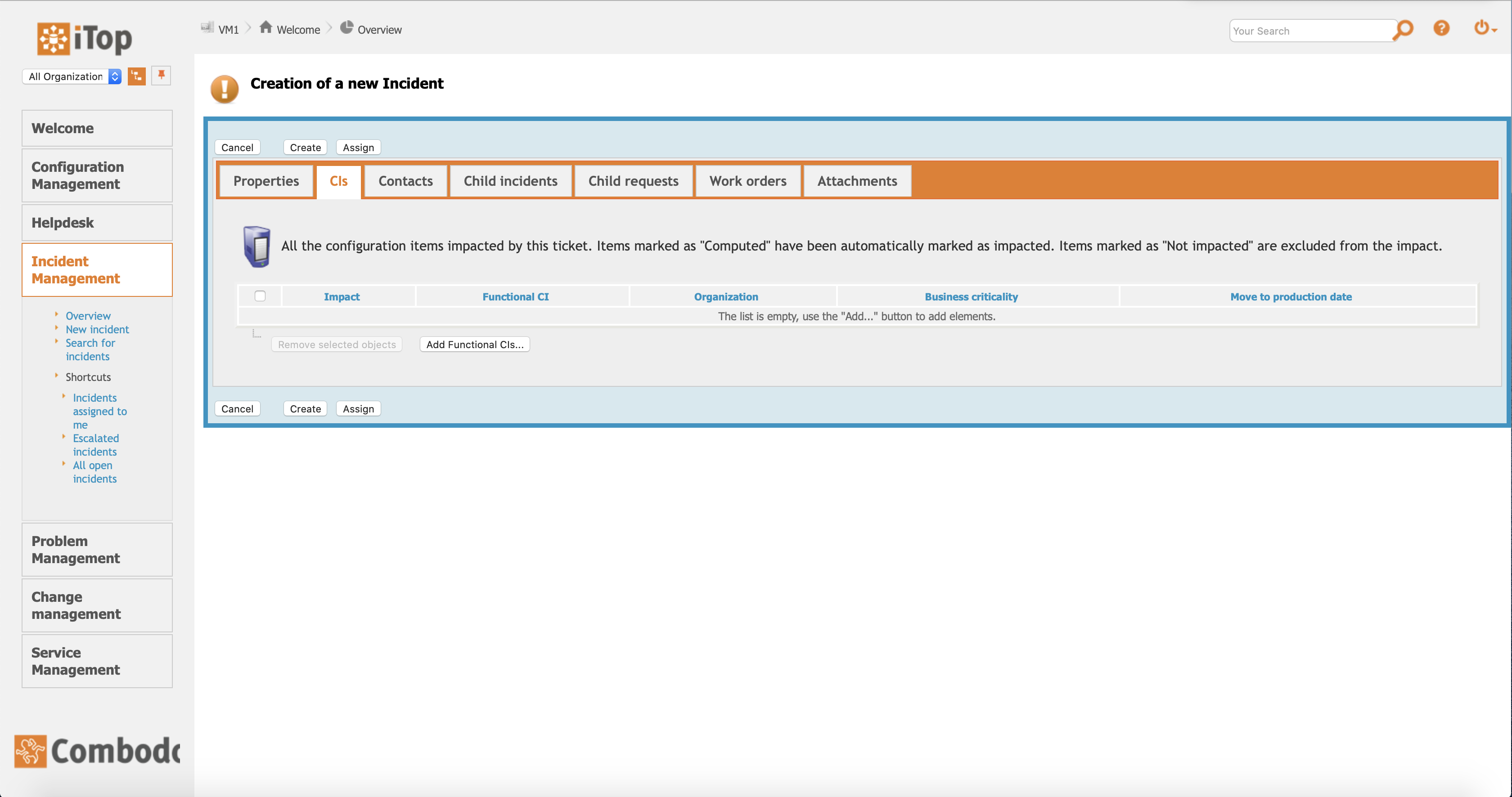Momentálne je vytvorený základný incident so základným popisom. Incident ale ešte nie je nijak prepojený s konfiguračnou databázou, resp. s položkami, s ktorými môže súvisieť. Po vytvorení a uložení incidentu teda môžeme popis rozšíriť aj o tieto aspekty. Pri zobrazení detailov incidentu zvoľte možnosť Modify, v pravej hornej časti. Opäť budeme môcť modifikovať záznam o incidente. Z hornej lišty vyberte záložku CIs. Tu môžeme pridávať a linkovať CI z CMDB, ktoré s incidentom môžu súvisieť.